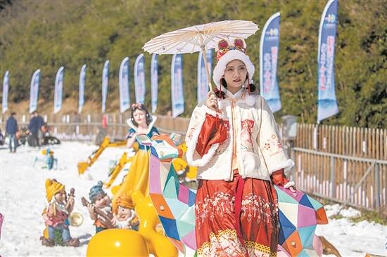 游人在重庆市南川区金佛山北坡滑雪场拍照,体验冰雪乐趣 新华社发