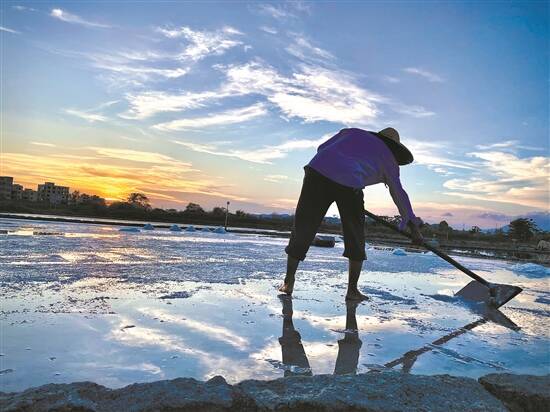 “听老一辈口口相传,以前岛上大部分都是盐田,大多数村民都从事晒盐行业。在我小时候,还能在岛上的盐仓看到,用布盖着的盐山。那时政府每隔一段时间就会前来收盐,并打包运走。”他说,后来村民改行从事水产养殖或者其他行业。现在这里是岛内最后一片完整的晒盐场,还保留着古老的制盐工艺。