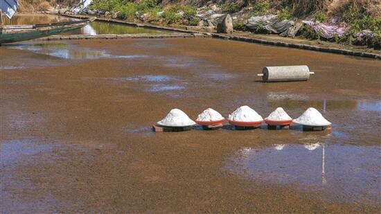 据他介绍,以前盐田生产主要有晒水与晒沙制法两种,后来淘汰了晒沙法,大部分村民采用晒水法。该方法首先将大潮时的海水引入储备池静置,使杂物沉降。其次采用梯田式晒水,将静置完毕的海水引入晒水池,经日晒蒸发后,海水含盐度达到一定程度时,依次引入到下一个晒水池,通过7次晒水,不断沉淀杂质,提高海水含盐度。最后将含盐度达到20度的海水抽入产盐池,并撒播盐种,在海水结晶达到一定厚度时,用盐耙把盐刮起。“每年只在秋冬时晒盐,目前盐田还能生产3万到5万斤,周边的居民会前来购买。”
