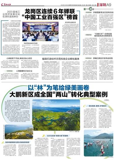 蓝天碧海、青山逶迤,深秋的深圳市大鹏新区天朗气清,喜讯频传:2023年9月,深圳市大鹏新区坝光古银叶树群入选全国“100个最美古树群”,是全国唯一入选的红树林古树群;2023年10月,大鹏新区入选全国“两山”转化的典型案例。生态环境部领导和专家指出,自2021年获评国家“绿水青山就是金山银山”实践创新基地以来,大鹏新区充分利用“山海”优势,大力推动蓝色文旅经济发展,为国内“两山”转化工作提供借鉴。