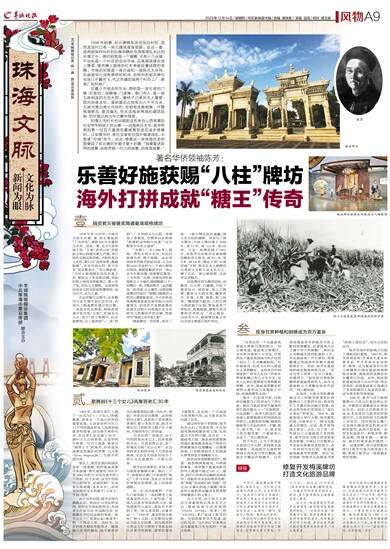 “光绪十二年(1886年),珠海一带发生特大水灾,村民们流离失所,慌不择路。远在异国他乡的陈芳获此信息,立马认捐5000美金折合三千两白银寄回国内,请朝廷赈济灾民。香山县令不敢怠慢,依据朝廷典章,上书至两广总督,光绪皇帝听到奏报后十分感动,随即赐建八(个)柱牌坊一座,并赐封陈芳二品顶戴加二级花翎,以示褒奖,这便是梅溪牌坊的来历。”两鬓已略微花白的刘云德娓娓道来,今天的他是珠海梅溪旅游发展有限公司的董事长,因其在开发梅溪牌坊旅游区过程中对珠海历史文化研究与挖掘所作的贡献,曾被评为“珠海文化年度人物”。