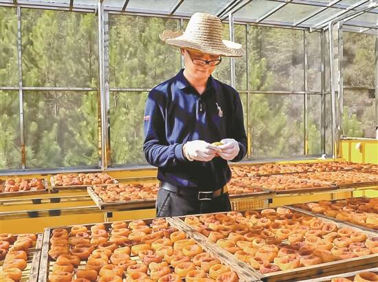 “大田柿花品质口感好,除了当地气候、水土及种植技术等因素外,最重要的便是其依旧采取传统手工为主的加工工艺。”张军权介绍,工人每天要逐个对晾晒的柿子进行捏掐,极其费时费力,“柿子经过筛选,个头大的拿来做大田柿花,个头较小的可以做成柿花酒或制成柿蜜罐头,也受到消费者喜爱。”