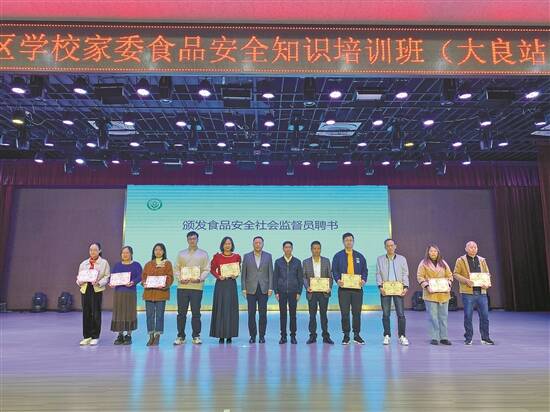 羊城晚报讯 记者杨苑莹、通讯员王雯摄影报道:近日,佛山顺德学校家委食品安全知识巡回培训宣讲活动第一站在大良华侨小学报告厅拉开帷幕。活动现场公布选聘首批170名家委为食品安全社会监督员,其中10名家委作为代表上台接受食品安全社会监督员聘书,学生家长从此可“持证上岗”监督校园食品安全。