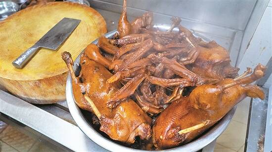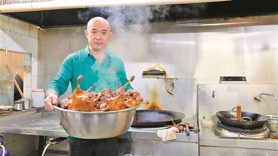 据介绍,碌鹅已有100多年历史,要做好碌鹅,挑鹅很有讲究,选取100~120天的草鹅仔公鹅,体重8.5斤到9斤为佳,“肉不肥腻也不会太瘦。除了新鲜鹅肉,配料和火候的把握也很重要,最根本的,还是不断翻动的手艺。”张旭辉说。