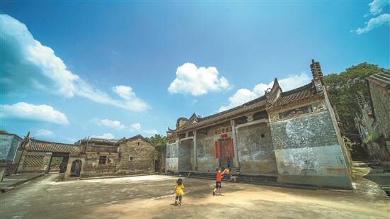 小孩在孟盛李公祠前嬉戏玩闹,村庄宁静质朴