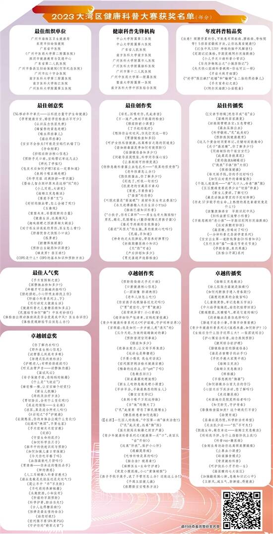 据了解,本次大赛共收到1076件投稿作品,设置13项大奖。12月27日,380件获奖作品在2023大湾区健康科普大赛颁奖盛典上颁发!