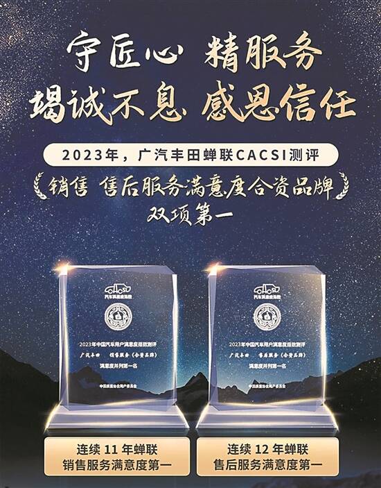 广汽丰田蝉联CACSI测评销售、售后服务满意度合资品牌双项第一