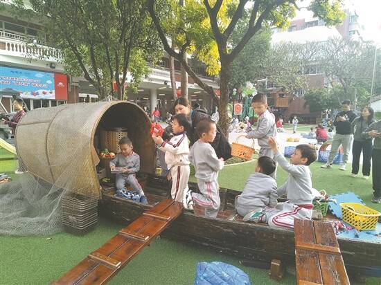 上月29日上午,在广州市越秀区东方红幼儿园内,近百位幼教观摩者用一个小时时间感受了这所名园的方方面面。在园内水池边,几个孩子专注地用塑料瓶子组建“火箭”和“小船”,利用水力推动其前行;几十米开外的创作区,孩子们在用枯叶、花朵和松果装饰着一顶“帐篷”;还有在纸板上肆意艺术创作的孩子、玩泥巴“玩得很野”的孩子,戏水池里打水仗很开心的孩子……每位参观人员都有一种感受:走进东方红幼儿园,第一眼看到的都是孩子,而几乎注意不到老师的存在。