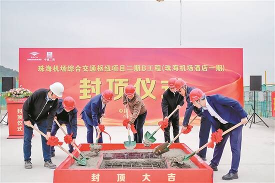 据介绍,珠海机场酒店项目位于金湾机场片区。项目主要功能为公寓式酒店及配套,分为地上9层、地下2层,建筑高度39.19米,总建筑面积约7.76万平方米。中建二局珠海机场酒店项目指挥长高全龙表示:“1月3日,项目全面封顶,预计将在2024年第十五届中国国际航空航天博览会前投入使用。”珠海航城机场建设有限公司规划设计部副部长王超称:“该项目酒店的投用将进一步提升珠海金湾机场以及整个金湾区的综合服务保障能力,完善服务配套功能,提高机场进出港旅客满意度。”