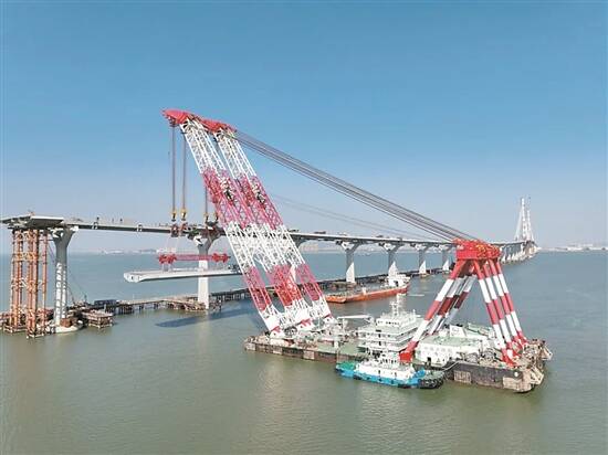 据介绍,黄茅海跨海通道中引桥为1600米钢箱连续梁桥,左右幅分离,中间设置横向连接箱,钢箱梁大节段共32节,最大节段长123米、宽18.75米、高4米、重1340吨。中引桥钢箱梁厂内整节段制造完成,再由运梁船运输至施工区域,采用中铁大桥局黄茅海跨海通道T4标自有设备“大桥海鸥号”3600吨浮吊进行整孔分幅架设。