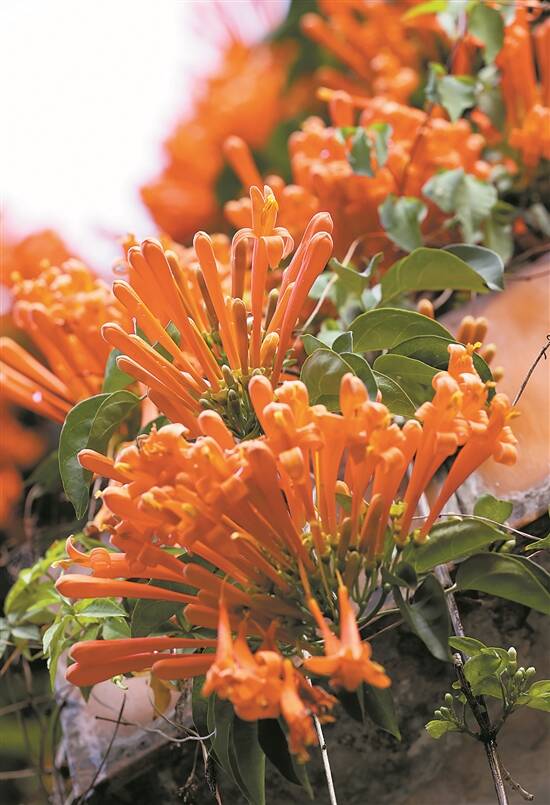 在东莞人民公园,细长管状的炮仗花,橙黄的花朵成串绽放,正如一串串正在燃放的鞭炮,因此得名“炮仗花”。公园的凤凰台旁、凉亭上……盘绕着正盛开的炮仗花,红红火火,应时应景应浓浓年味。