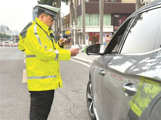 与此同时,在金鸡路翠前南路路口,珠海市公安局交通警察支队香洲大队三中队指导员凌志云拦停了一辆白色小轿车。在检查了司机的驾驶证、行驶证后,凌志云提醒司机:“您的车辆有违章还未处理,而且也还没做年检,请尽快处理!”