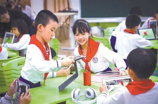 沙面小学御景校区数字化书法智慧教室于2018年投入使用,这是广州市荔湾区首间数字化书法智慧教室,让传统书法教育插上现代信息化的翅膀。“谁掌握了未来的学习方式,谁就能在今后学得越多、学得越好。”姚丹表示,智能时代是一个人机共存、人机协同的时代,“智慧校园的建设要推动以素养为本的课堂改革,转变学生的学习方式才能更好地适应未来社会。我们学校智慧课堂的实施以协同为基本理念,通过人机协同实现师生之间、生生之间的协同。同时注重智慧学习环境的生态,兼容各种不同的平台和硬件。”