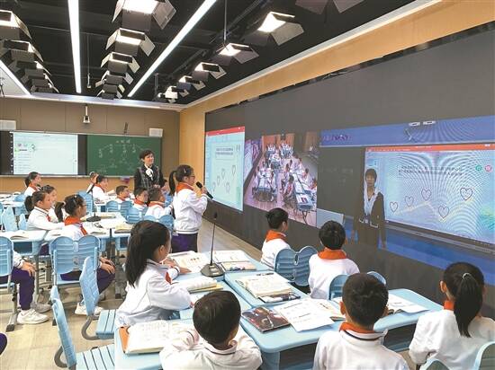 在智慧课堂上,两地学生虽远在千里,却能通过5G视频和人工智能教学平台、智能数码笔等展示两地同学对同一道题目的表述,两地老师分别对同学的解答进行点评分析,这一举措可以说让优质课堂实现了空间跨越。“未来的教育生态会彻底打通学校与学校、学校与家庭、学校与社会之间的壁垒,实现全新的社会教育资源共享和配置。”广州市第六中学副校长江玉军说。