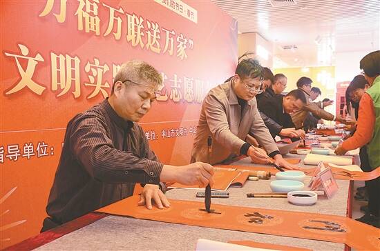 今年是中山举行“万福万联送万家”送春联活动的第十年。当天,林锐熙等参加活动的领导嘉宾上台,共同启动2024年“龙腾伶仃洋 文明新中山”主题系列文明实践活动。