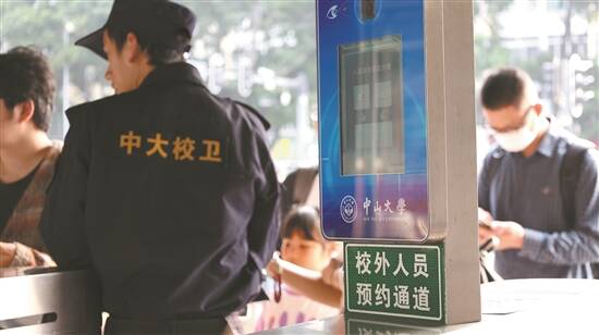 记者实地观察发现,中大南校园南门为游客入校指定校门,分为两侧通道,左边为师生通道,右边为校外人员通道,入口处摆有预约提示牌,安保人员对游客预约信息进行核查。