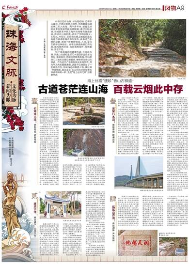 位于珠海境内的岐澳古道、长南迳古道、凤凰山古道和金星门水道四条古道水陆并行,承接南北,均是古代联系珠海、中山和澳门三地的主要交通要道,被统称为香山古驿道。作为近代广东地区民众走向世界、开风气之先的重要通道,这里不仅涌现出了一批闻名中外、影响深远的重要人物,并以其“开放创新、群英荟萃”的文化特点在南粤古驿道中独树一帜,更是“海上丝绸之路”的重要节点。