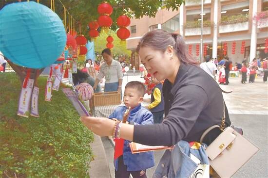 广东省公安厅幼儿院庙会活动上,家长与孩子一起猜灯谜
