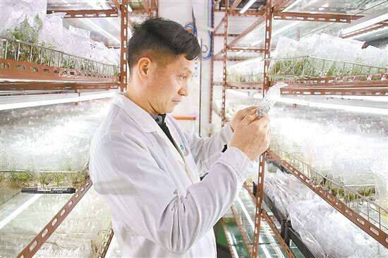 鹏力农业负责人罗纪锋正在查看新培植的种苗
