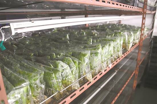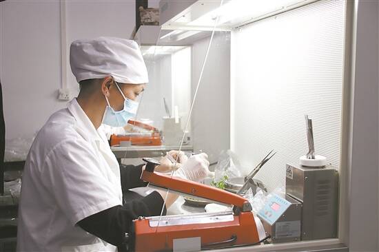 鹏力农业无菌组培育苗实验室内,工作人员正在进行培苗