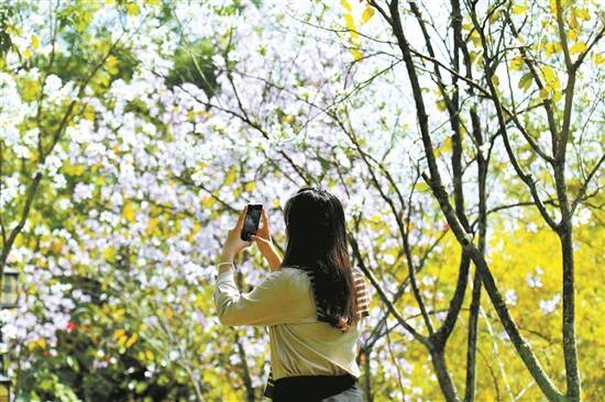 清明节前夕,东莞各大森林公园迎来了赏花的黄金季节。其中,被誉为“莞深绿色屏障”的塘厦大屏嶂森林公园,黄花风铃木、美丽异木棉竞相开放,吸引了众多莞深两地市民前来赏花踏青,其中包括家住塘厦的深圳人杨先生。每逢周末天气晴好,杨先生都会邀请三五好友一同到大屏嶂森林公园,感受大自然的气息。最近,他听说东莞大屏嶂森林公园的黄花风铃木和美丽异木棉正在盛开,便立刻邀请好友展开了一次赏花之旅。