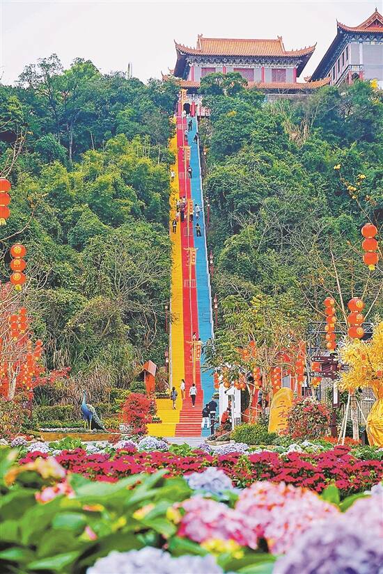“来观音山,上春山,赏百花。”观音山森林公园管委会主任陈景玉告诉记者,今年花朝节的主题为“上春山 踏青行”,自3月17日开始至“五一”结束。相比往年,今年花朝节花卉规模更大,摆放更集中,赏花景点更精致。不仅升级改造了一批彩色林,栽种红绣球、玫瑰、三角梅以及各类兰花品种,还打造了特色系列“花式”主题的场景,包括巨型玫瑰花束、“镜”上添花、品秀、百花榜等系列网红打卡点。据介绍,本届花朝节共举办多场活动,首场以“百花朝春”为主题,设有女皇领衔、花神赐福、簪花巡游、赏红许愿等活动环节,吸引游客围观互动。“游客来了,不再是单纯看花,而是引导其去赏花、摆花,让游客更有沉浸式的赏花体验”。