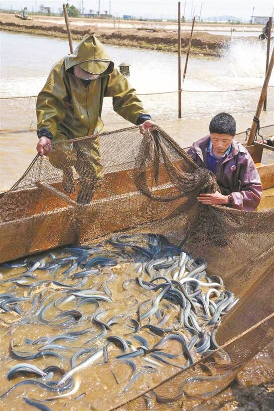 眼下正是鳗鱼集中捕捞的时节,湾口村的鳗鱼养殖户铆足干劲张网捕鱼,一条条肥美的鳗鱼随着渔网出水,溅起的水珠在阳光中闪耀,为丰收再添上一抹亮色。在鱼塘里,工人们分工合作,有的手拿渔网捕捞鳗鱼,有的正在操作台上徒手分拣鳗鱼,根据鱼的大小熟练地分级。