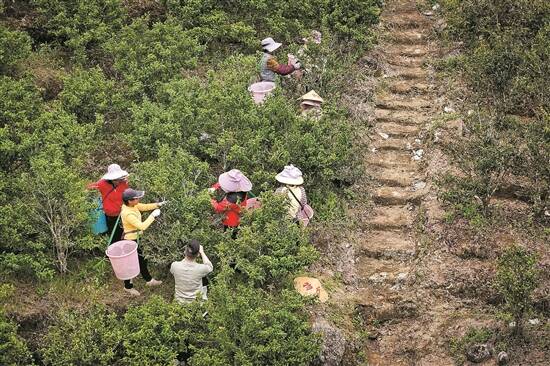 漫步凤凰山,阵阵香气弥漫,经过蜿蜒而平坦的山路,焕然一新的棋盘村呈现在眼前。采茶人的身影在村中茶园、茶山里穿梭不停,十指灵动、指尖翻转,一片片鲜嫩的芽尖便被收入茶篓中,村中新修的山路上,不时有茶农运送着装满茶叶的箩筐下山抢抓时间制茶,共同勾勒出一幅“芽叶芬芳香万家,山中茶客采茶忙”的春日景象。