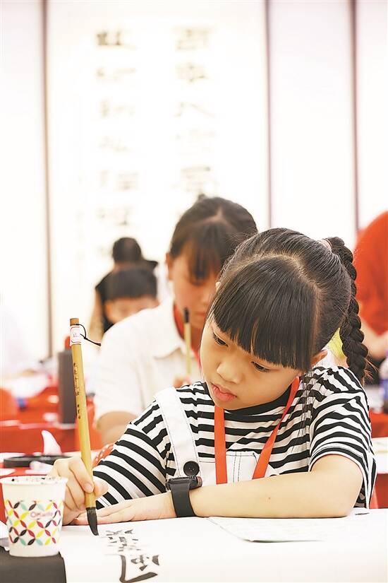 “从小学二年级开始学习,书法是我一直在坚持的一个爱好。”已经是初中生的黄睿多年一直潜心于书法的练习,从楷书、隶书到去年参赛书写的行书,她都有自己的见解。黄睿说,可能是自己对书法文化接触较多的缘故,她对非遗、刺绣等各种传统文化都比较追崇,对自己的学习带来很大启发。“我很喜欢王羲之,最喜欢他的交友态度。”学习书法两年的王一心则通过书法了解到一些古人的故事,时常会向往他们的一些性格品质。