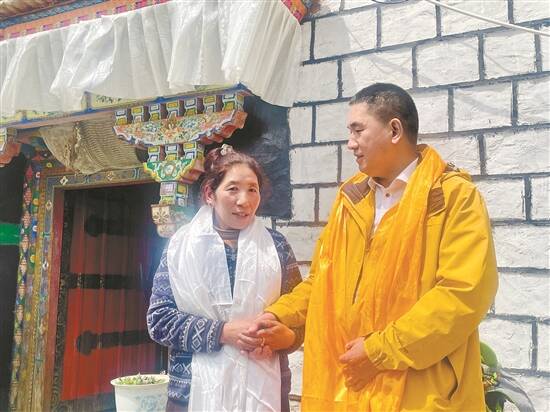一看到为她主刀的雒洪志来访,惊喜的仁增曲珍立刻握着雒洪志的手,全程紧紧不放,一边赶紧交代家人,为雒洪志准备了一条黄色哈达——在西藏黄色哈达一般是敬献给生命中最尊贵的人。“不舍得你走呀!广东医生就像是我爸爸妈妈一样的家人。”仁增曲珍拉着雒洪志的手说。“放心!我们的援藏医生还会一茬接一茬地来!”雒洪志说。