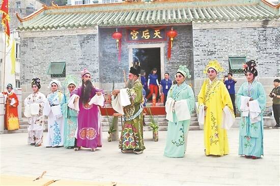 妈祖诞庆典第一天(农历三月廿二)早上,粤剧团在天后宫门前演《八仙贺寿》 陈月婷 摄