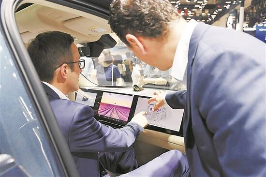 在北京车展上,观众在体验问界M9新能源汽车智能座舱 新华社发