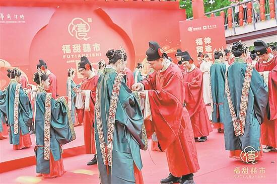 前来现场观礼的市民朋友,除了感受传统婚俗的魅力,还能参加主办方在现场精心打造的宋代市集,化身古人感受当时的市井生活。现场同时设置婚姻辅导摊位,由专业辅导老师向新人及群众提供婚姻家庭方面的咨询和辅导,倡导家庭家教家风之传统美德。现场还设置了商家展示摊位,主要邀请婚庆策划、婚纱摄影、酒店、婚车、礼品、首饰等企业,向现场群众展示优惠产品或套餐。
