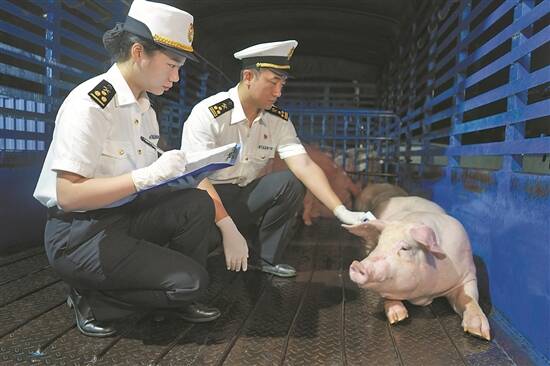 羊城晚报讯 记者李旭、通讯员陈翰梓报道:5月25日凌晨4时,两辆装载着210头湖南活猪的大货车到达位于珠海市斗门区八甲村的供澳活猪过驳站。已提前就位的拱北海关所属斗门海关关员王东涛和刘寒手持手电筒及红外线测温仪,上前对这批活猪开展入场前预检。二人仔细查看了每头猪的状态,逐一验核运输车辆封识、《动物卫生证书》等,并认真做好现场检疫记录。检查无误后,该批活猪经过驳台“换乘”至粤澳跨境运输车辆上继续运往拱北口岸,经口岸海关快捷验放后出口澳门。