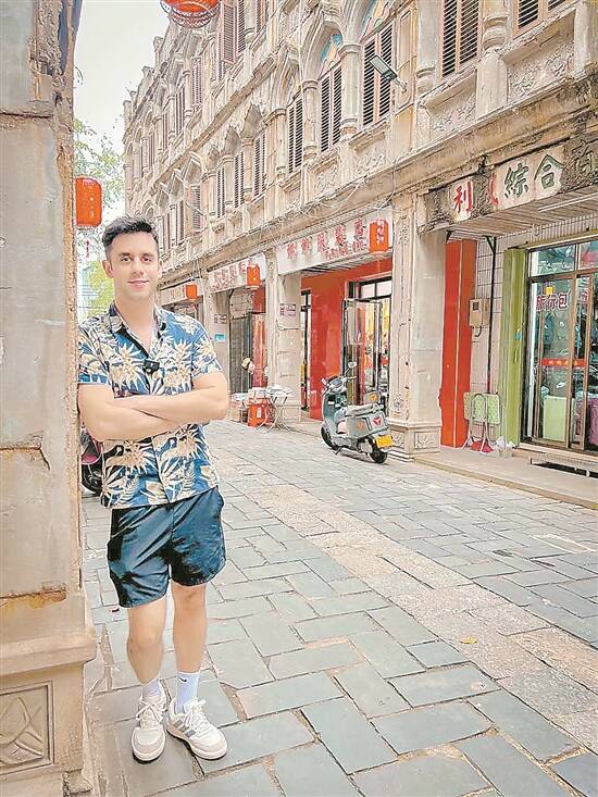 拉斐尔在厦门中山路步行街上打卡拍照