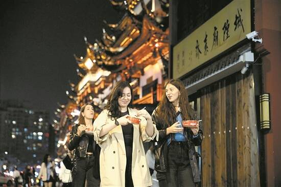 外国游客在上海城隍庙品尝小吃