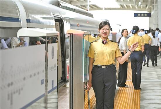 乘务人员在佛莞城际铁路东莞麻涌站指引乘客 新华社发