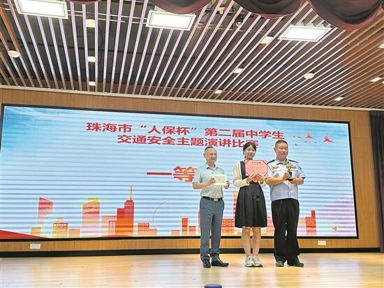 日前,珠海市第二届中学生交通安全主题演讲比赛决赛在珠海市文园中学礼和校区举行。赛事由珠海市教育局、珠海市公安局交通警察支队等单位联合主办,来自珠海市容国团中学的选手柯思盈从12名选手中脱颖而出,荣获赛事一等奖。