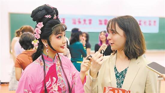 罗樱梓(左)用全英文采访国际友人,了解他们对潮剧的感受和跨文化传播相关建议