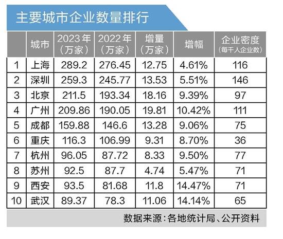 排名第三的是深圳,2023年,净增企业数量13.53万户;新登记企业数量30.75万家,排名第二。