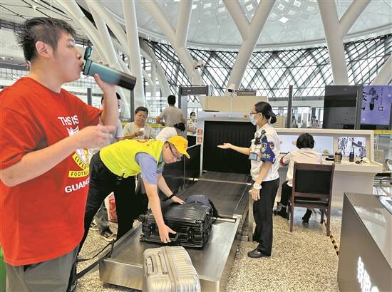 江门站工作人员及志愿者引导旅客通过安检进站
