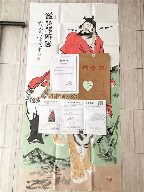 例如,范女士的父亲收到的一幅《钟馗福威图》,商家直接将画折叠后寄出,导致画上出现了不少人为的褶皱。所谓的授权书仅是一张打印纸,上面只有一个名为“文化宣传部”的印章,且没有具体的名字和日期。关于该“中国书画收藏鉴定中心”出具的鉴定书,不仅没有明确的鉴定机构名称,在正规网站上也查询不到相关编号。