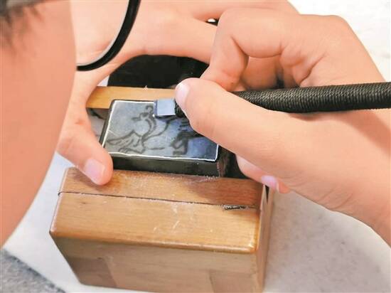 若说前半程是提笔,后半程则是提刀。为防止印石在篆刻期间伤到手指,需将印石固定在印床,还可保证印石“稳如泰山”。手握刻刀将其以倾斜的角度立在印面上,与石头进行点的接触,后以手大臂发力,推动手方向往前,在短促的“咔咔”声中,坚硬的印面上便出现了一道刻痕。值得注意的是,使用刻刀时,发力点需一直集中在刻刀与石头的接触点上,这样才可“下笔如有神”,呈现出既平稳又有深度的刻痕。反之,如未找到发力点,篆刻者易感到手臂疲累,刻痕深浅不一,印面坑坑洼洼。