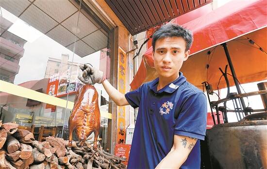 每天清早,叶永强都要亲力亲为准备烧鹅,将腌制风干的大鹅送进烤炉中,荔枝柴火燃烧地吱呀作响。正值盛夏,在炉子边忙活就一会儿,就汗流浃背。“做烧鹅要熬得苦,一个人一辈子能把一件事做好,就已经很了不起。”去年,叶永强开始教儿子做烧鹅,管店铺,希望儿子能把做烧鹅的接力棒稳稳接住。