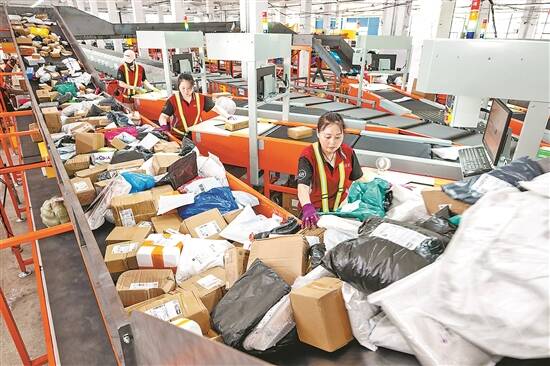 快递企业工作人员忙着分拣、扫描出库等工作 新华社发