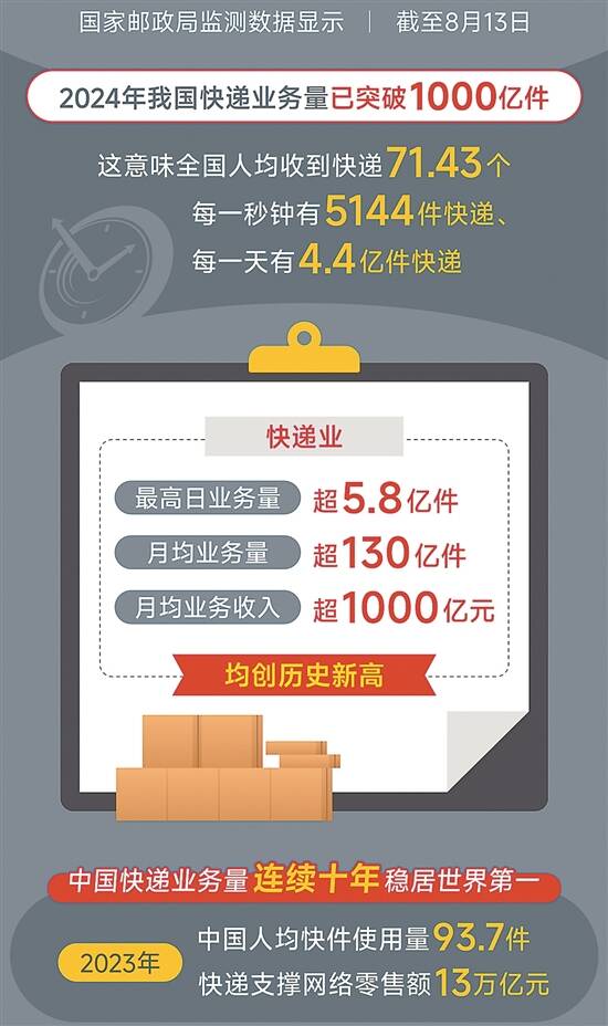 国家邮政局监测数据显示,截至8月13日,今年我国快递业务量已突破1000亿件,比2023年达到千亿件提前了71天,凸显出我国快递市场的繁荣活跃和发展质效的不断提升,折射出我国经济发展的活力与韧性。这意味着全国人均收到快递71.43个,每一秒钟有5144件快递、每一天有4.4亿件快递在神州大地上流动。