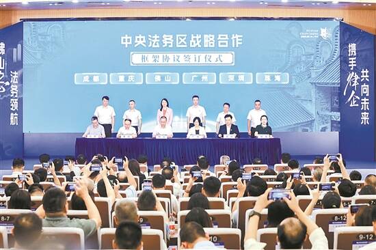 在启动仪式举行现场,佛山中央法务区与天府中央法务区、西部金融法律服务中心、广州湾区中央法务区(天河片区)、河套国际商事调解中心、珠海市涉外公共法律服务中心〔横琴珠港澳(涉外)公共法律服务中心〕五地代表签订了战略合作框架协议。之后,佛山将与这五地的法务区加强合作、互联互通,充分学习、吸收优秀经验,打造贴合本地实际、独具特色的佛山中央法务区。