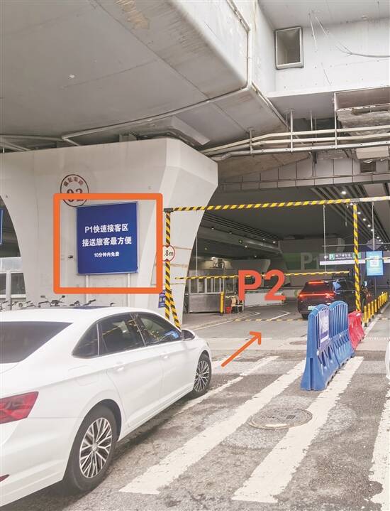 广州南站P2停车场入口,门口石墩上张贴着P1的标识牌。不过,P1和P2停车费不同