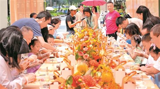 位于中心街区的古风游园会更是人气爆棚。“云纱秋月”非遗簪花、“拾桂秋茶”自制花茶、“大漆往事”非遗团扇、“国潮茶点”茶果子、“花灯初上”手工彩绘灯,以及供游客免费体验传统书法和围棋的摊位,轻纱浮动,古风意境满满。晚间,不少市民现场或休憩片刻,谈笑间隙抬头赏月,或在非遗摊位前体验一番亲手制作团扇、簪花的别样趣味。小镇体验人群中不乏外国友人的身影,“我喜欢体验并深入了解中国传统习俗,这些丰富多彩的文化活动让我感到很开心。”一位外国友人现场接受记者采访时开心地表示。