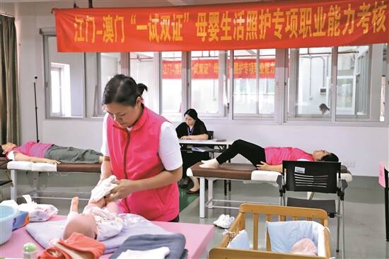 羊城晚报讯 记者陈卓栋、通讯员江人宣摄影报道:记者近日从江门市人社局获悉,日前,江澳“一试双证”母婴生活照护专项职业能力考核在江门市(省级)高技能人才公共实训基地展开,在澳门特别行政区政府劳工事务局和澳门妇女联合总会精心组织下,28名澳门学员来到江门参加江澳“一试双证”母婴生活照护专项职业能力考核,标志着江澳两地技能人才交流与合作的又一里程碑。